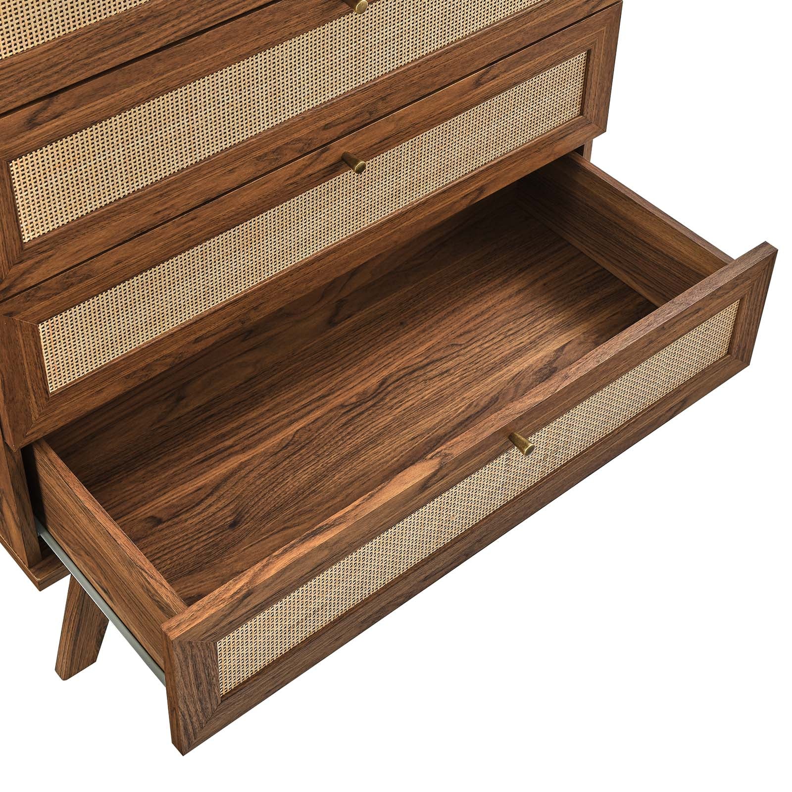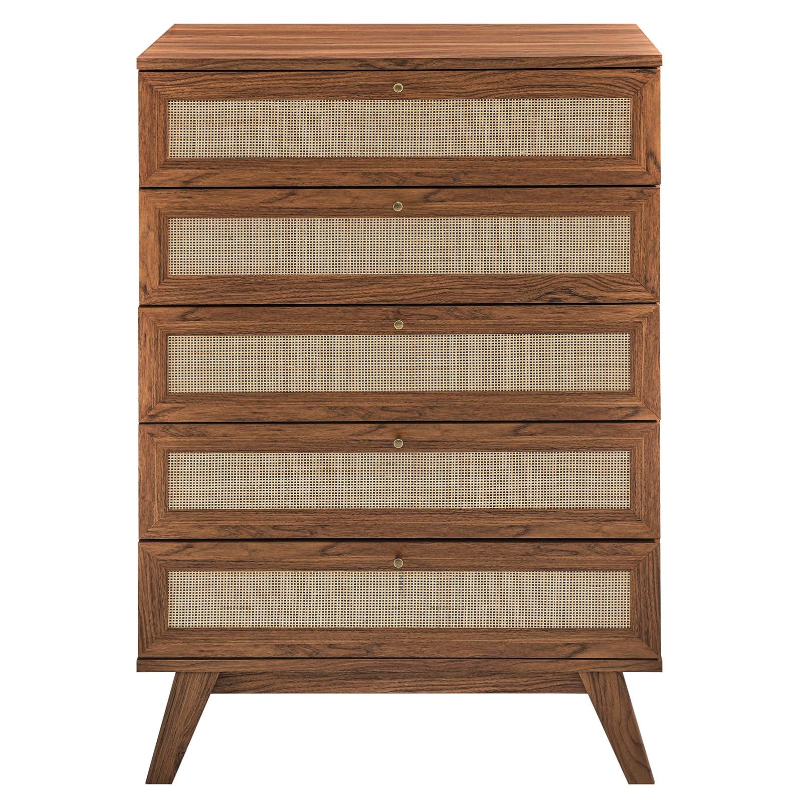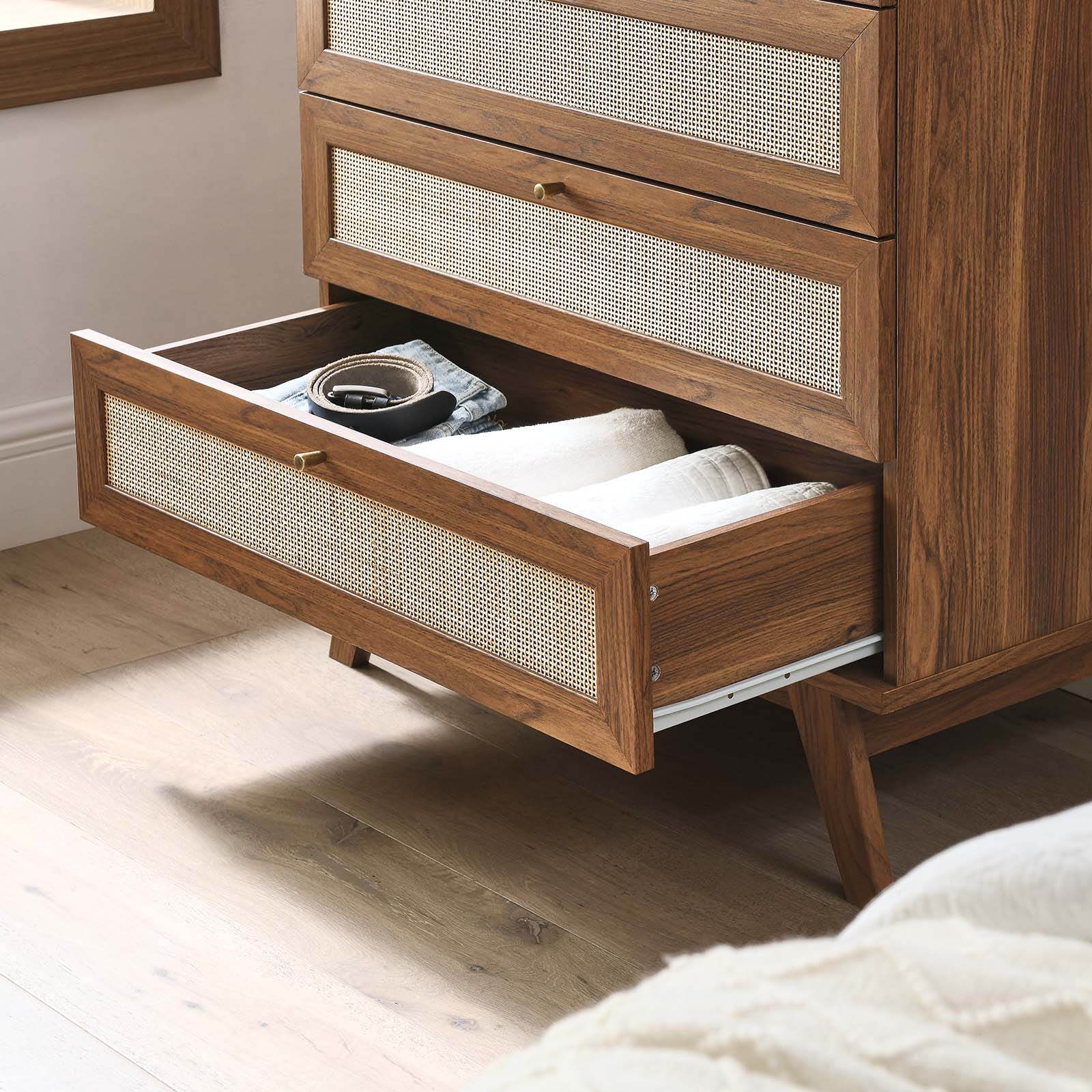 Introduce refreshing style to a Fjordary or guest bedroom with the Arcane 5-Drawer Dresser. Showcasing a beautiful rattan weave on the squared drawer fronts, this chest of drawers brings organic aesthetics and modern functionality to a bedroom space. This tall dresser is crafted from durable MDF and particleboard with a natural wood grain finish. This bedroom chest is complete with five full-extension glide drawers to offer ample storage space for bedroom essentials, clothes, linens, and more. Resting on splayed legs, Arcane includes non-marking foot pads to protect flooring. Assembly required.