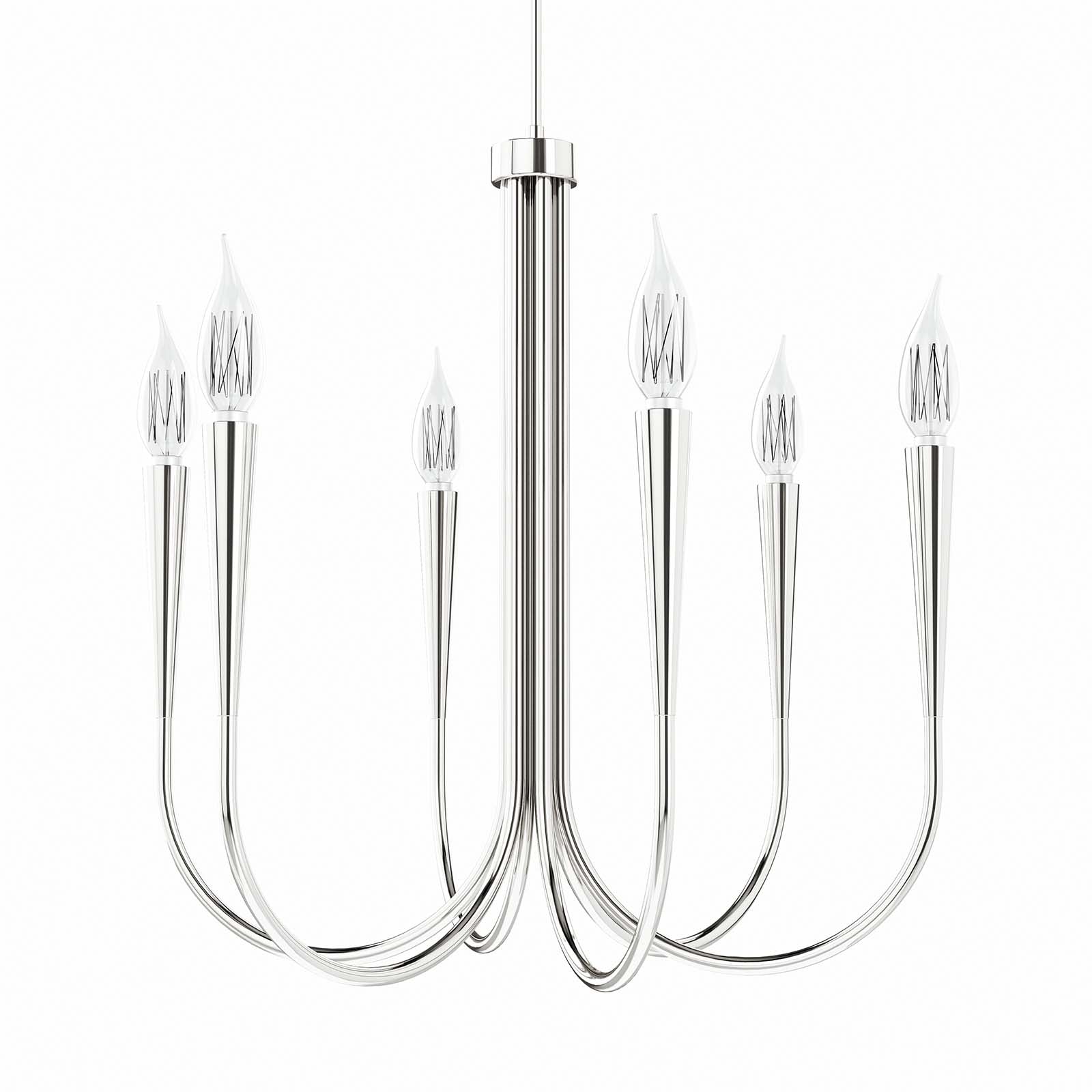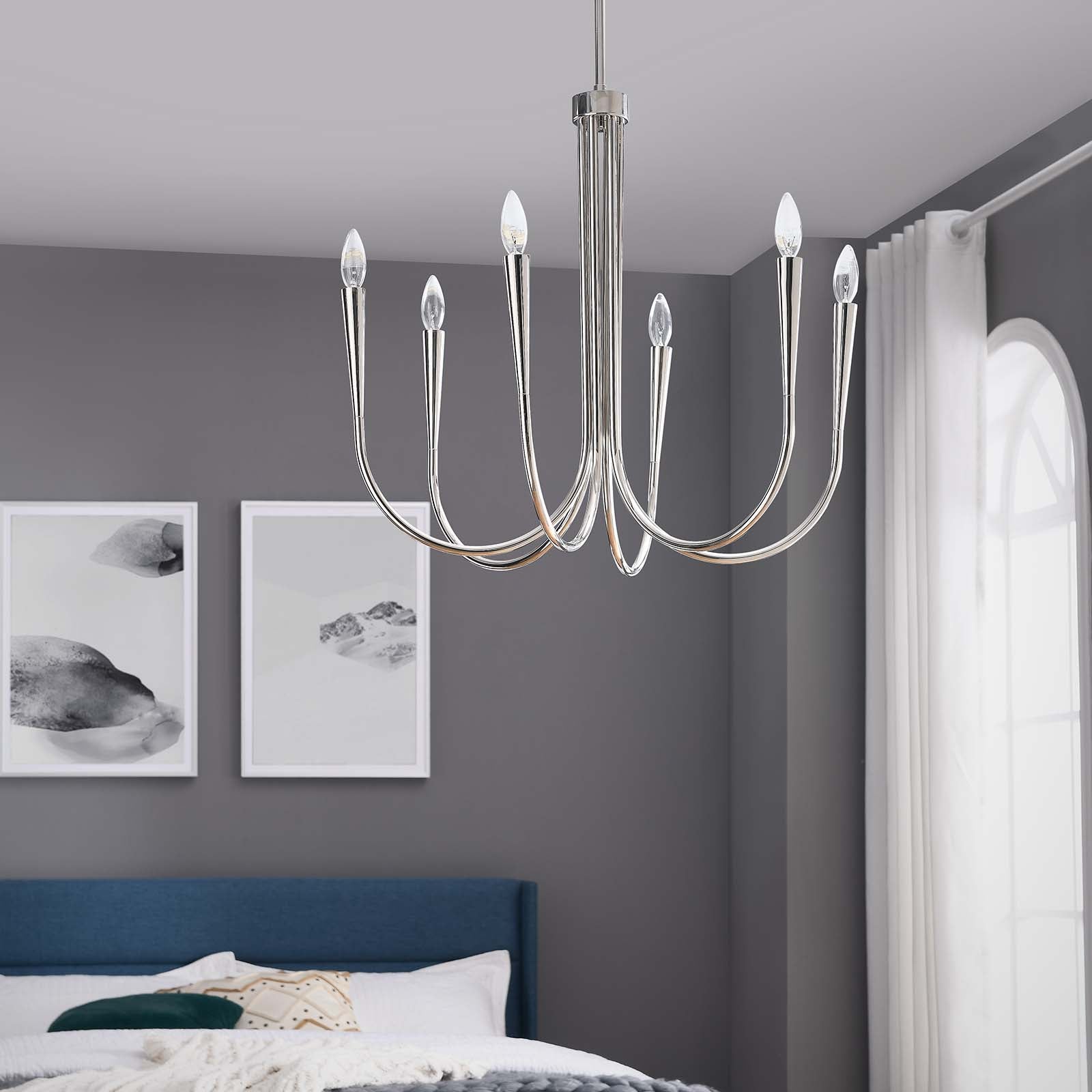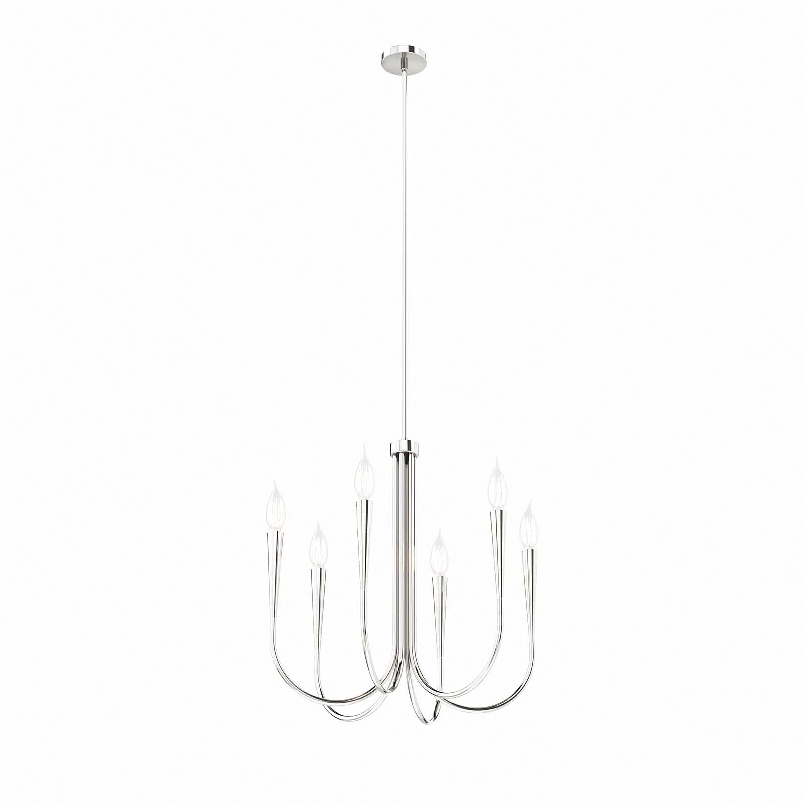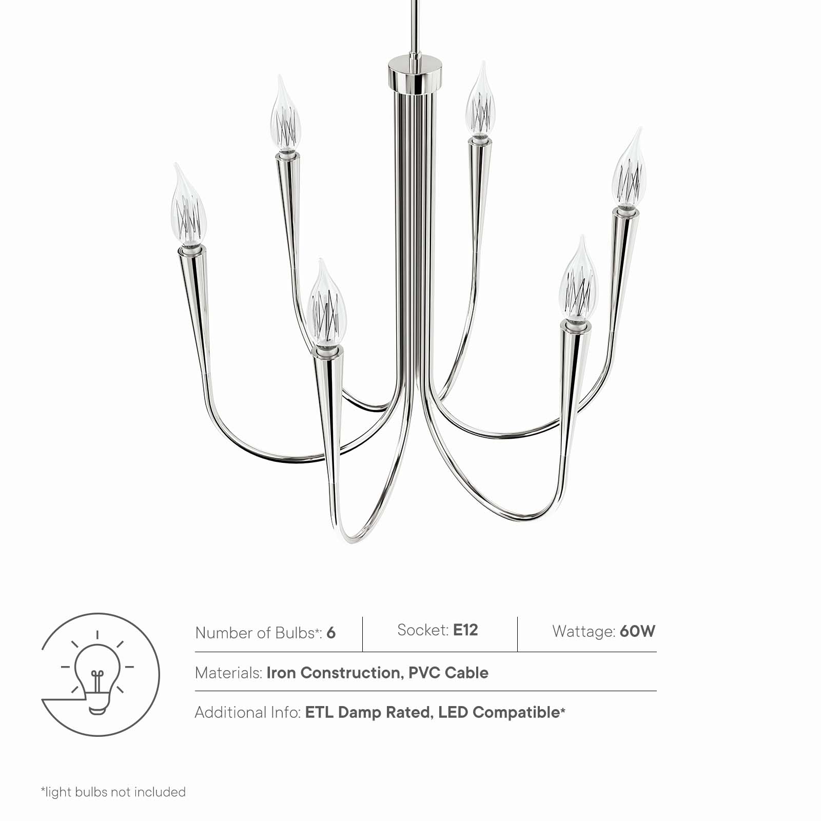 Sweeping lines and modern simplicity make the Brielle 6-Light Chandelier center stage in a home or apartment. A beautiful light fixture in the dining room, entryway, bathroom, or other living space, this pendant chandelier features six upturned metal arms that each hold a single exposed bulb (not included). Compatible with sloped ceilings, Brielle has a ceiling canopy with a swivel adaptor and features a five piece, height-adjustable hanging rod to suit a range of ceiling heights. This chandelier requires six E12 bulbs 60W max or LED equivalent (not included). UL Listed for Damp Locations. Luminaires that are “Suitable for Damp Locations” are approved for areas that are regularly exposed to moisture and condensation like the bathroom. Professional installation required.