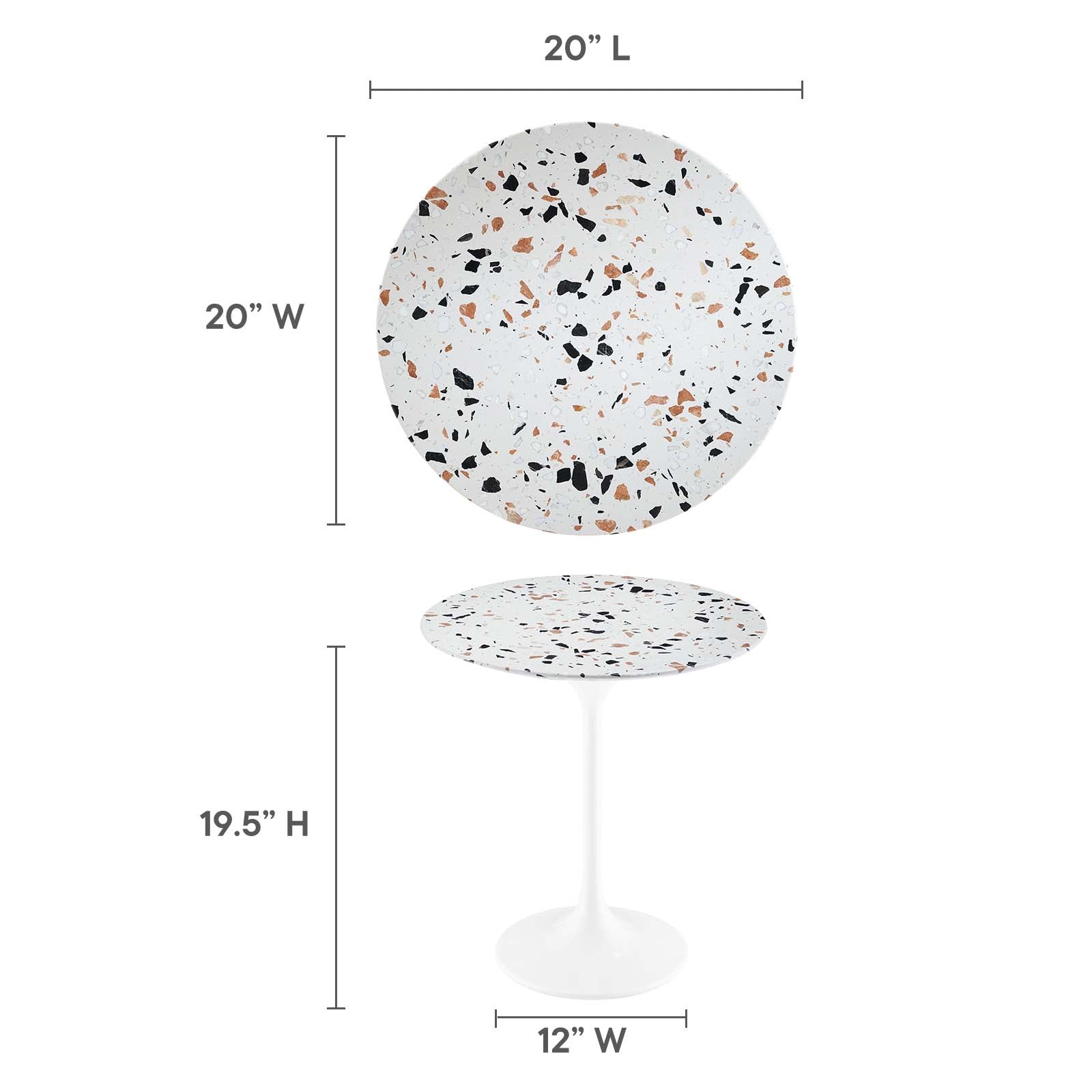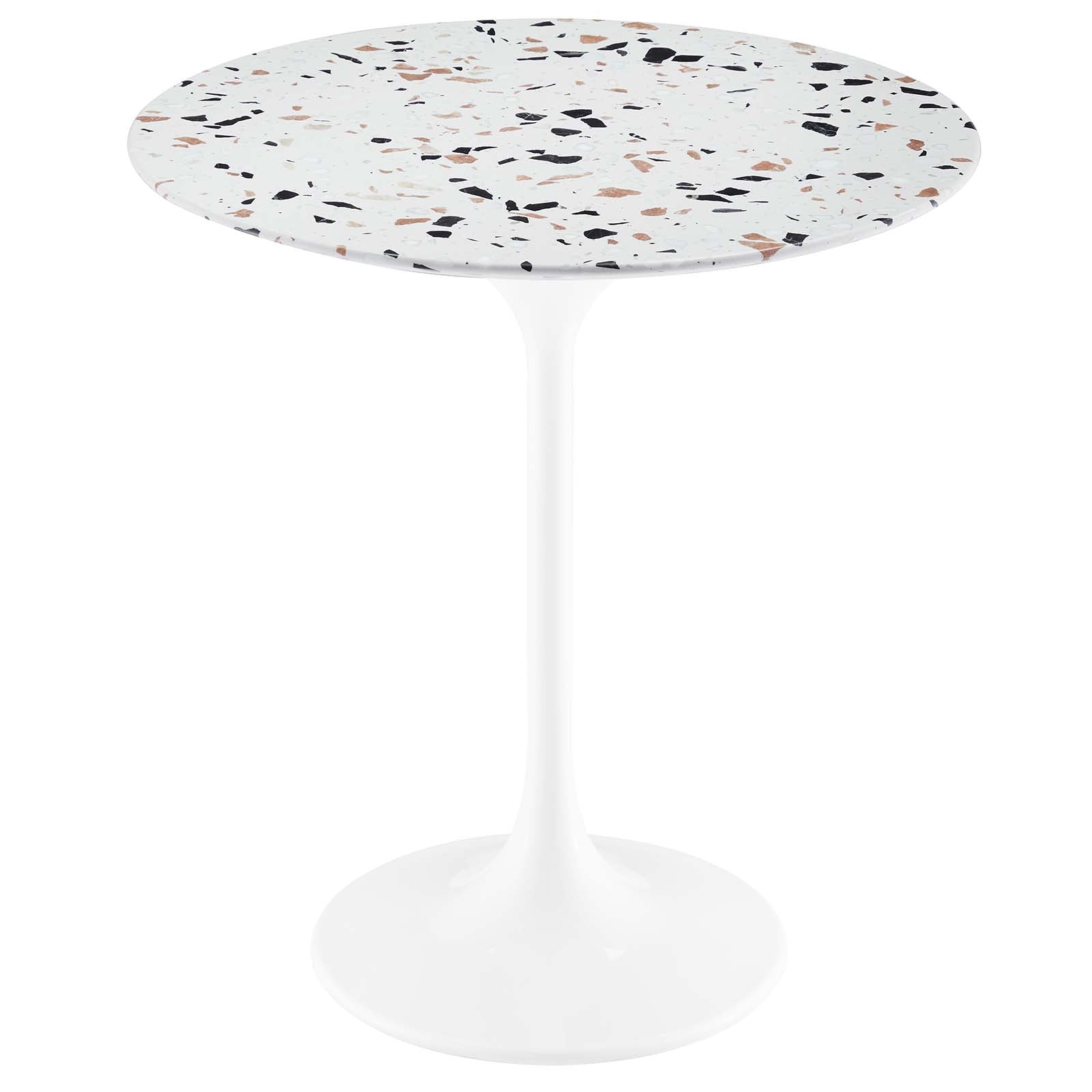 Let modern inspiration flow from the Dewdrop 20" Round Side Table. This pedestal table is perfect for the living room, office, lounge area, or entryway. Its round tabletop is crafted with terrazzo and features a beveled edge for a contemporary yet timeless design. Embodying an iconic mid-century silhouette, this pedestal dining table floats on a sleek tapered metal pedestal base with a chip-resistant lacquered finish. Includes non-marking felt pad to protect flooring. Assembly required.
