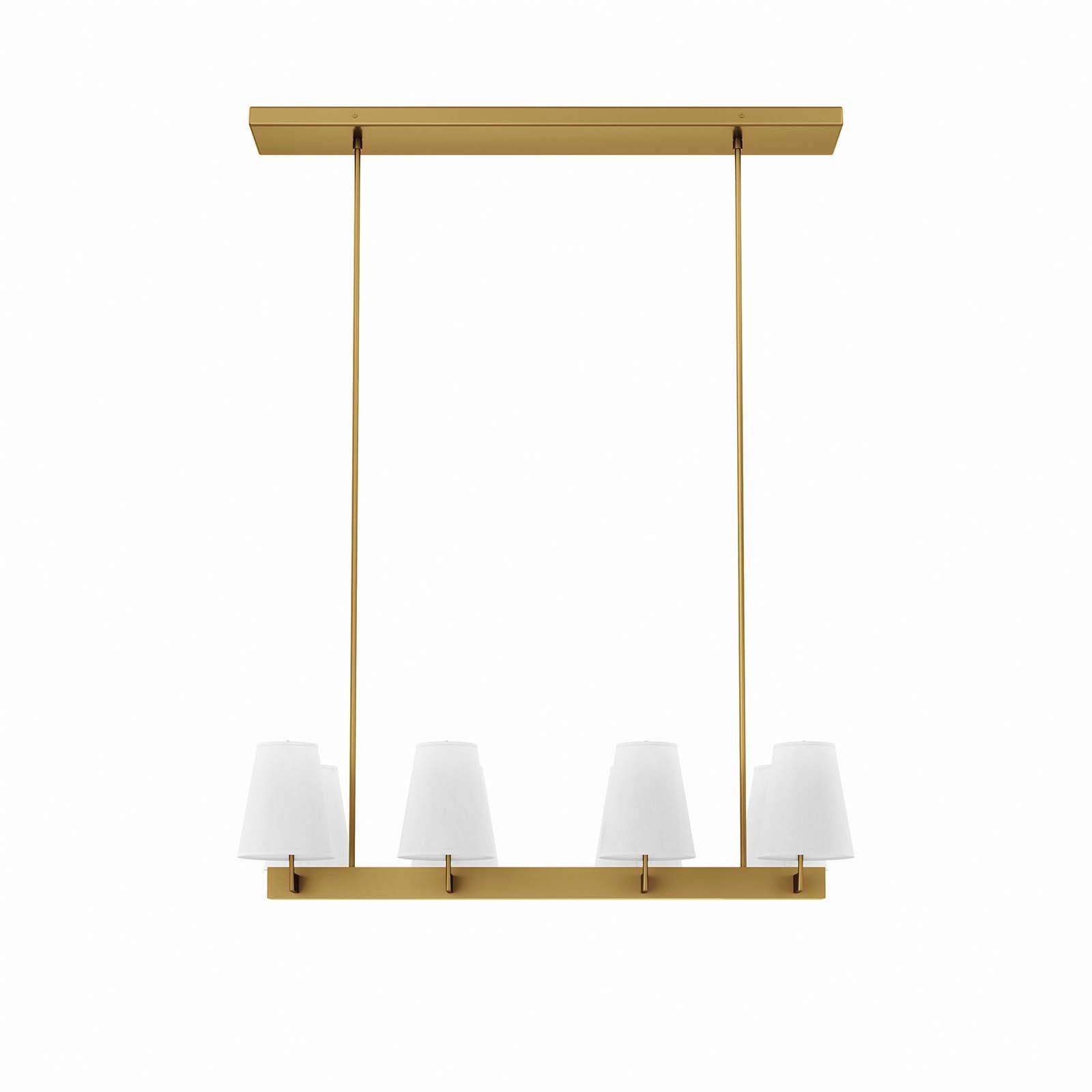 The Evoke 8-Light Chandelier brings modern grandeur to a living room, dining room, entryway, bedroom, or office. This linear pendant light features two rows of fabric cone shades covering eight lightbulbs that require E26 bulbs 60W maximum or LED equivalent (not included). Compatible with sloped ceilings, Evoke has a rectangular ceiling canopy with swivel adaptors and features two five-piece, height-adjustable hanging rods to suit a range of ceiling heights. ETL Listed for Damp Locations. Luminaires that are “Suitable for Damp Locations” are approved for areas that are regularly exposed to moisture and condensation. Professional installation required.