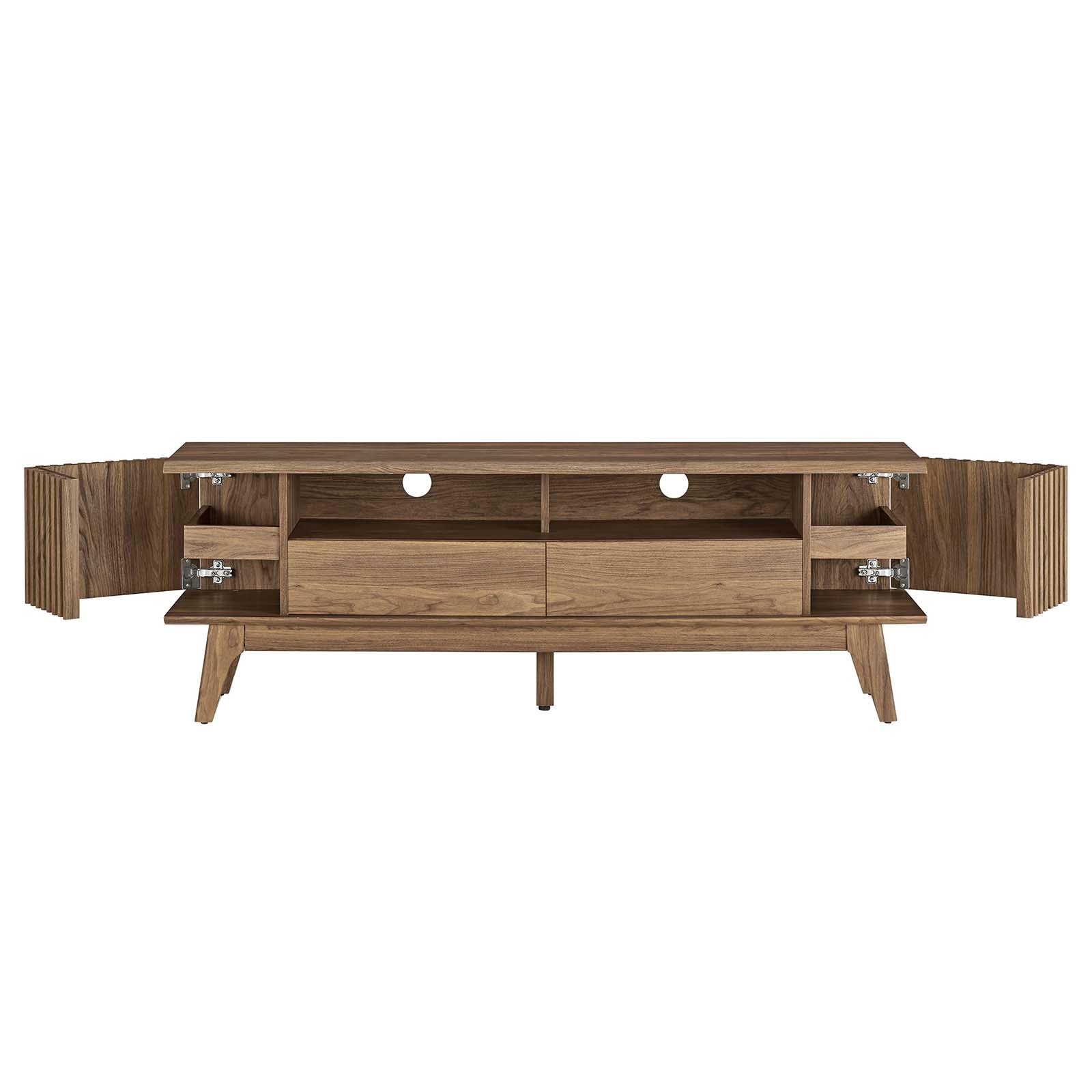 Transform your living space with the Indie 60" Media Console. Constructed with MDF and particleboard with a beautiful wood grain design, this entertainment console is both stylish and durable. The perfect addition to a living room, family room, or lounge area, this versatile piece serves its purpose as a modern TV stand with ample storage for media essentials and cable management holes. Vertical slatting on the hinged doors grants elegant definition to its overall look. With open and concealed shelving areas and full-glide drawers, this media center is designed for both storage and display. Bringing mid-century inspiration to the home, its splayed base and non-marking foot pads ensure stability and protect your floors from scratches. Assembly is required, but our easy-to-follow instructions make it a breeze. Weight Capacity: 200 lbs.
