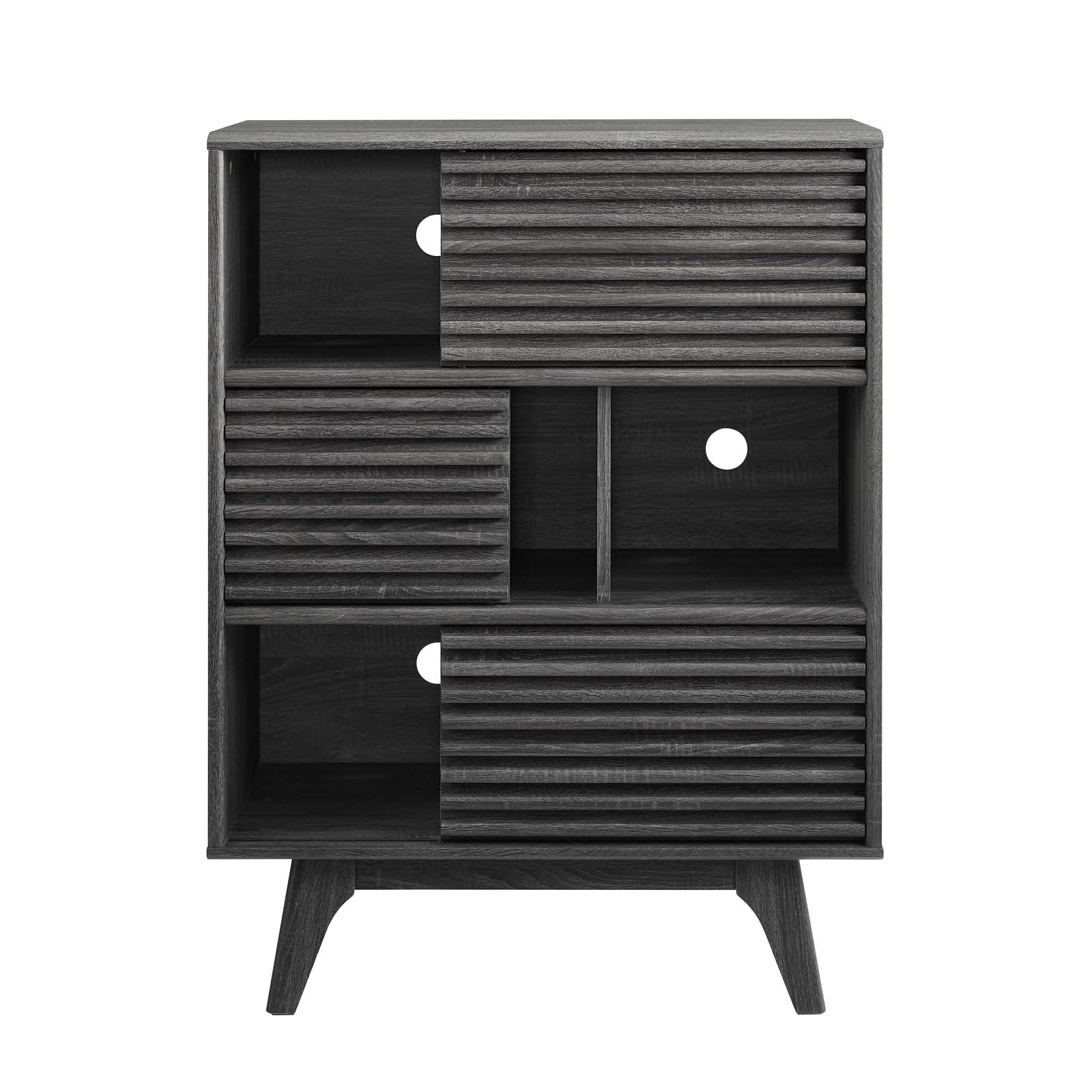 Tap into mid-century aesthetics with the Juno Three-Tier Display Storage Stand. This living room storage cabinet features a durable particleboard frame with smooth walnut grain laminate, four tapered wood legs, cable management holes for media storage, and three shelves with sliding doors for a versatile open and concealed storage effect. Juno makes it easy to create a customizable arrangement for your pictures, books, vases, media, and decorative accents. Boasting a mid-century modern style this accent table features a solid construction with a pleasing look and practical functionality.