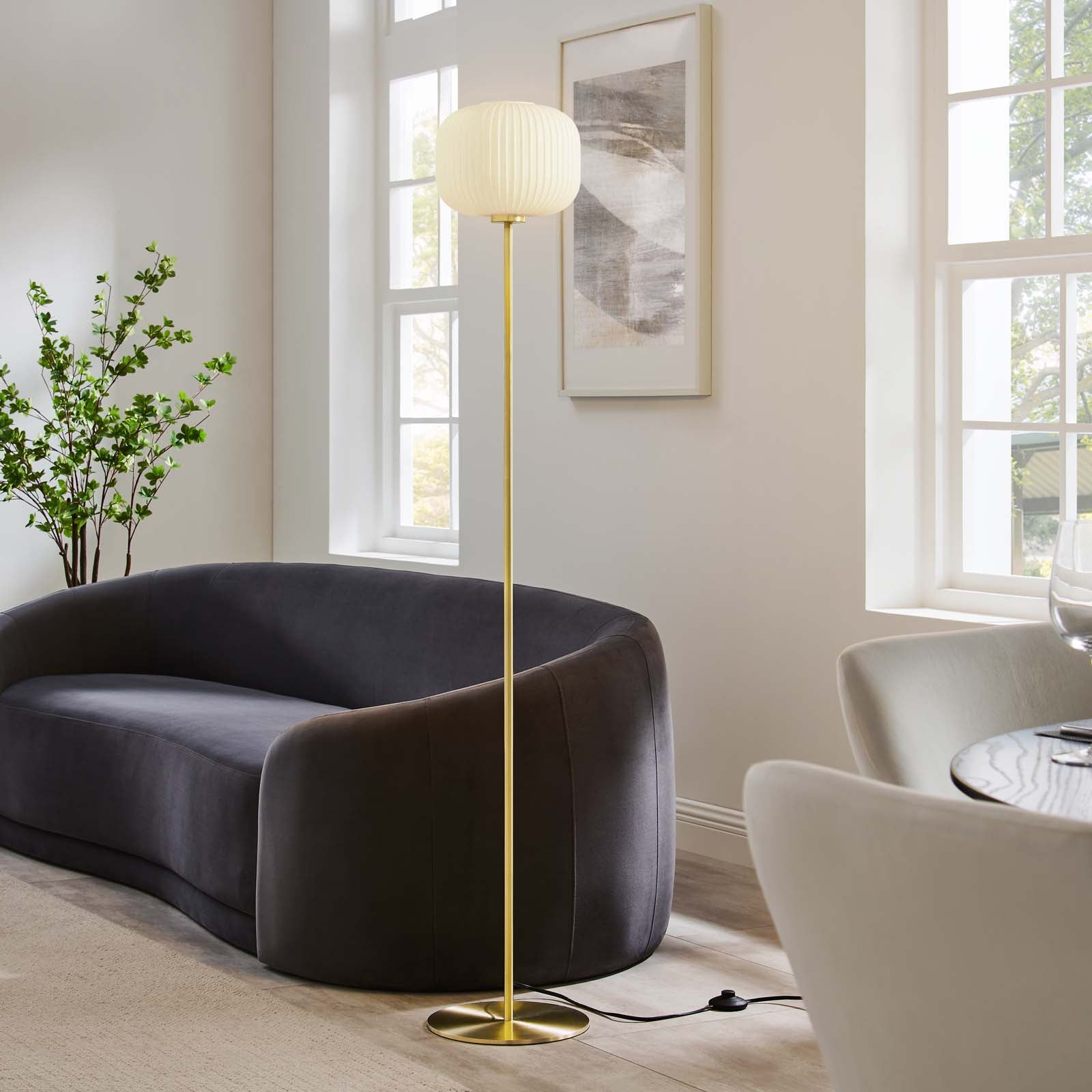 Introduce ingenuity and nuanced retro style into your home lighting design. The iconically shaped Kova Floor Lamp brings structure, texture, and a warm transparent glow in your bedroom, living room, entryway, or office. The opaque glass shade is softly textured with embossed horizontal lines creating a commanding living room floor lamp in mid-century modern, contemporary, or eclectic decors. This tall standing lamp combines elegance and functionality with rich satin brass accents and an open top allowing easy bulb access. Kova is a dimmable standing lamp for the bedroom (dimmer switch not included), requiring 1 E26 60W max bulb or LED equivalent (not included). Easy access on/off floor switch on a black cable. Assembly required. Clean with a soft, damp cloth.