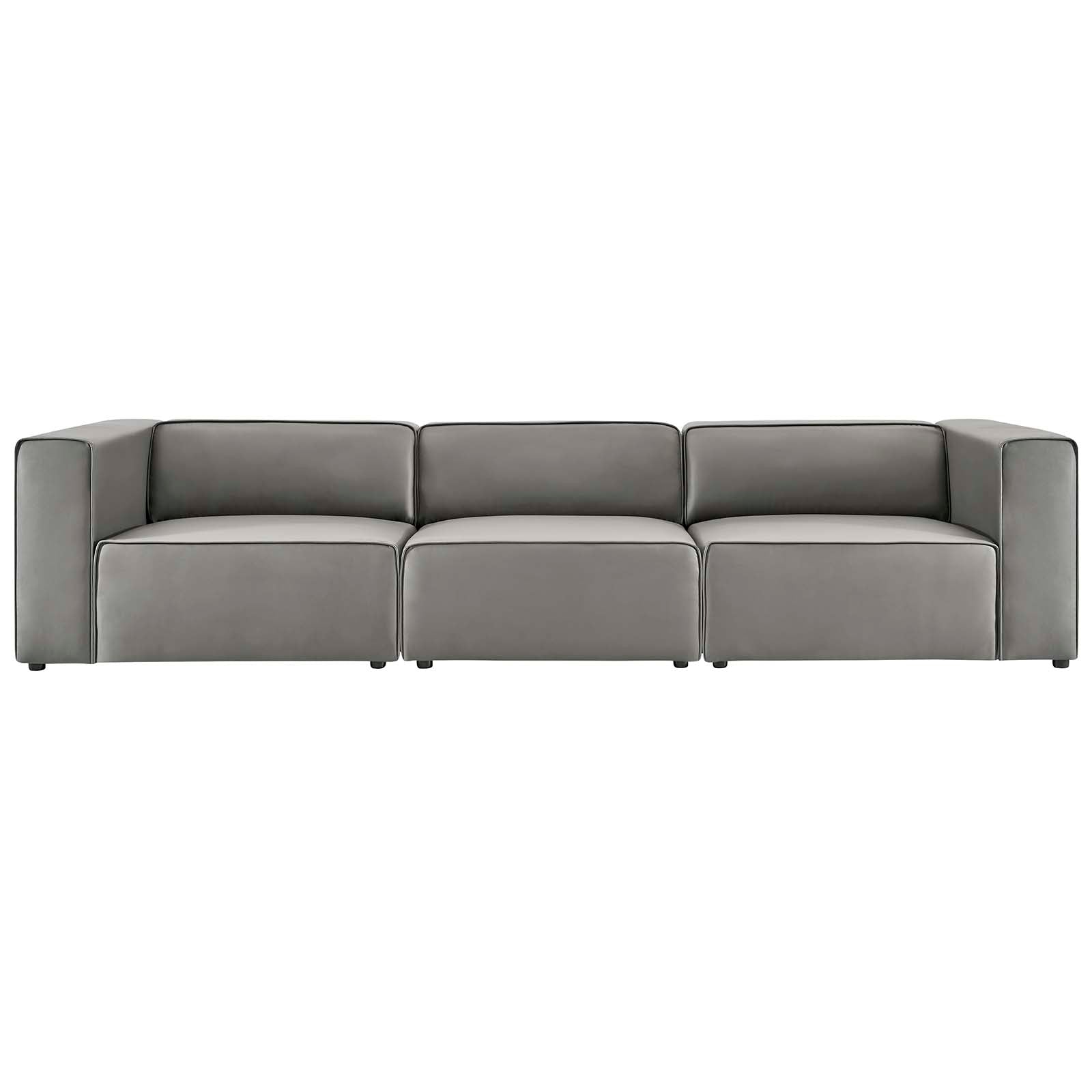 Kick back and relax with the Moda Sofa in Gray Vegan Leather. Designed to wash away the hindrances that obstruct visual space, this three-seater sofa comes expansively designed with generous seating and dense foam padding that allows for just the right amount of giving. Moda easily positions according to the needs of the moment and features rich vegan leather upholstery with elegant piping and plastic legs for steady support. Host animated living or lounge room get-togethers with a modular sectional seating assortment perfect for contemporary modern décors.