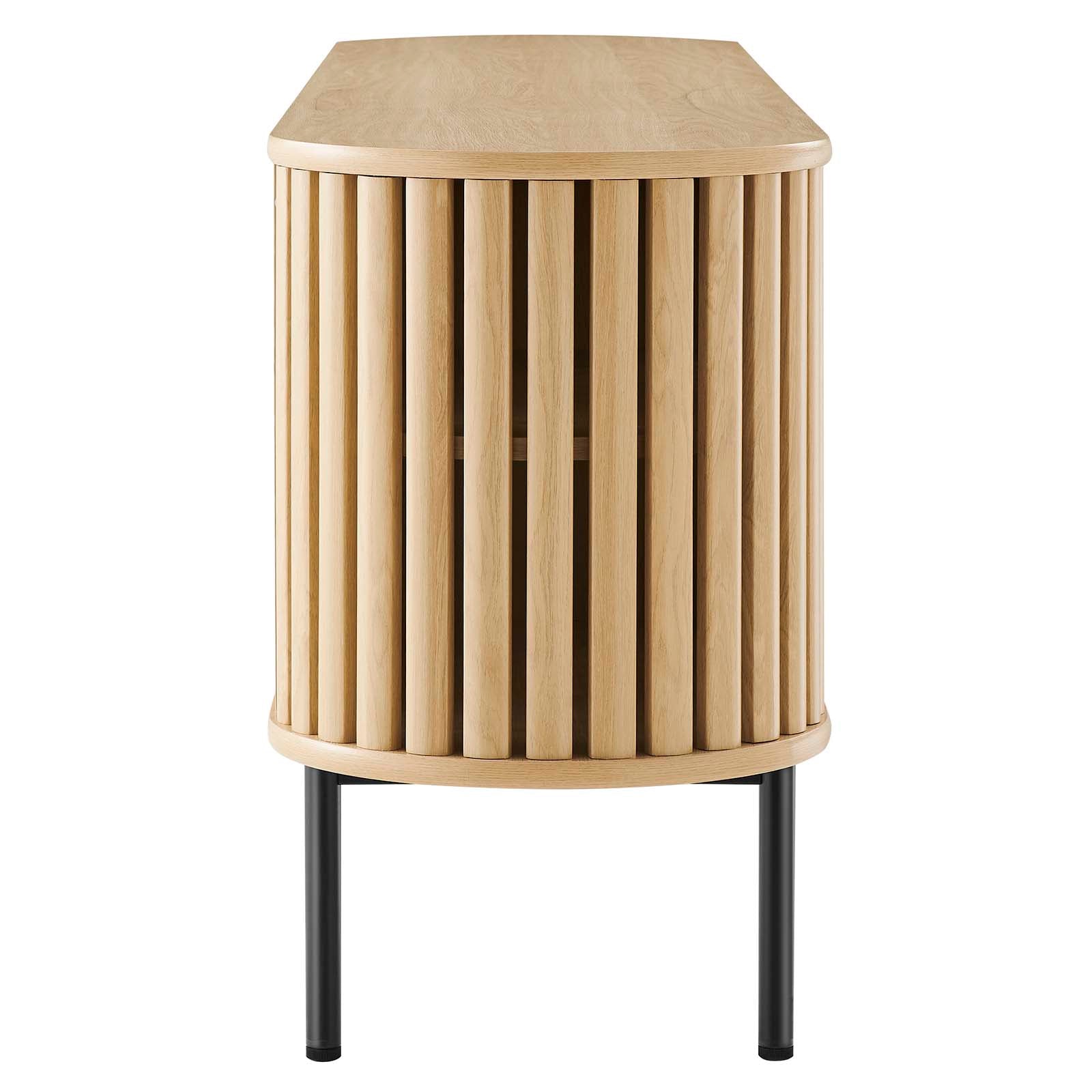 Embrace the clean lines and contemporary style of the Moxie 71" Media Console in Oak. Showcasing a captivating oval shape, this TV stand brings a modern aesthetic to any room. The open middle storage area accommodates media accessories and includes an open back for seamless cable management. Two adjustable center shelves allow for versatile storage options, while two front sliding timber strip style doors offer a unique and attractive look. Constructed from MDF and particleboard with a natural wood grain finish, Moxie rests on straight round black metal legs for a sleek look. This high profile TV stand has a weight capacity of 200 lbs and supports flat screen TVs up to 78 inches, blending functionality and style to suit your entertainment needs. Includes non-marking foot caps. Assembly required.