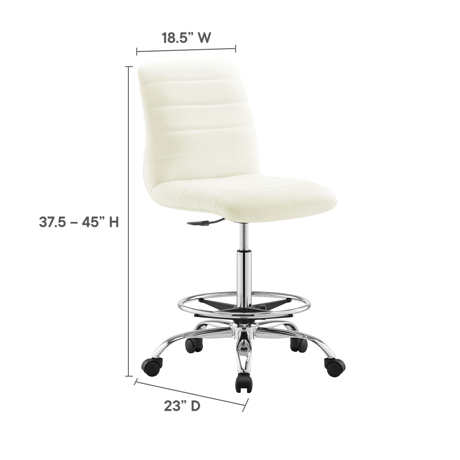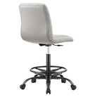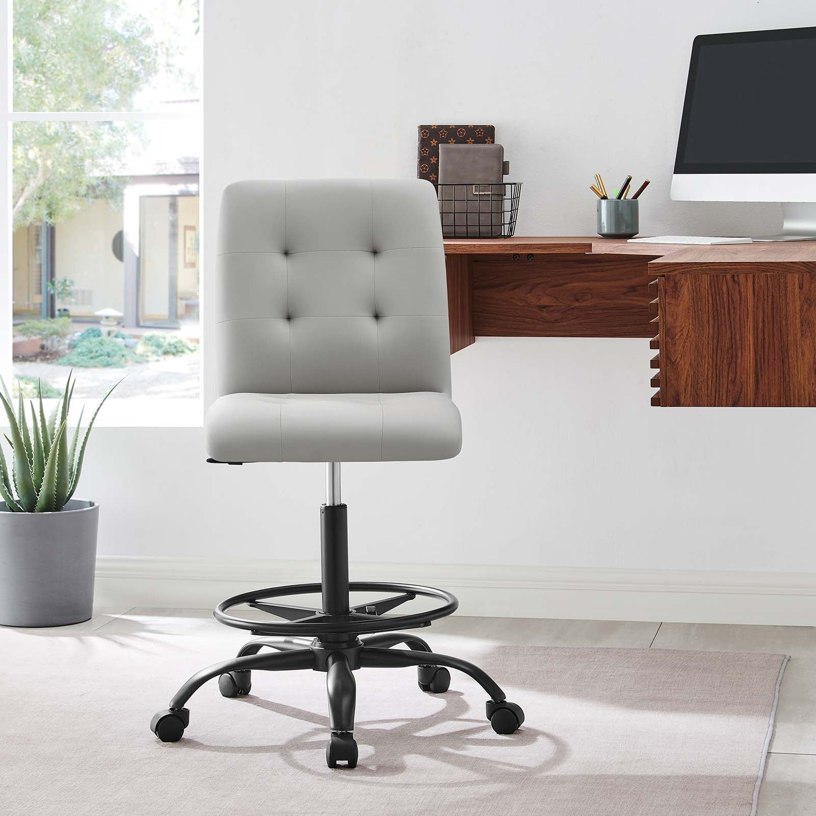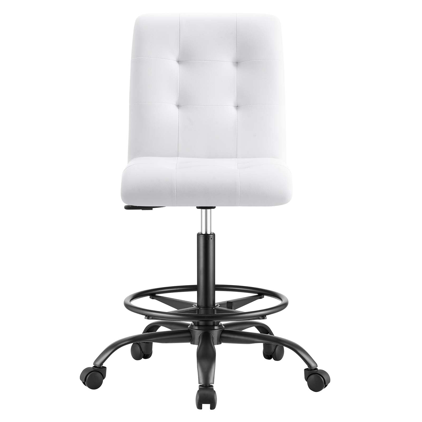 Focus on the task at hand while bringing modern style to your workspace with the Nomad Armless Drafting Chair. Outfitted with a matte black frame and five dual-wheel casters for easy mobility over hardwood or carpeted surfaces, this padded drafting stool is upholstered in durable vegan leather and covered in dense foam for added comfort. An ergonomic choice for workstations, this vegan leather drafting-height office chair features a mid-back design, channel tufting, and fine stitching throughout. This drafting chair is fully height adjustable with a 360-degree swivel and its drafting-height makes it suitable for standing desks, drafting tables, reception desks, and more. Assembly required. Weight Capacity: 287 lbs.