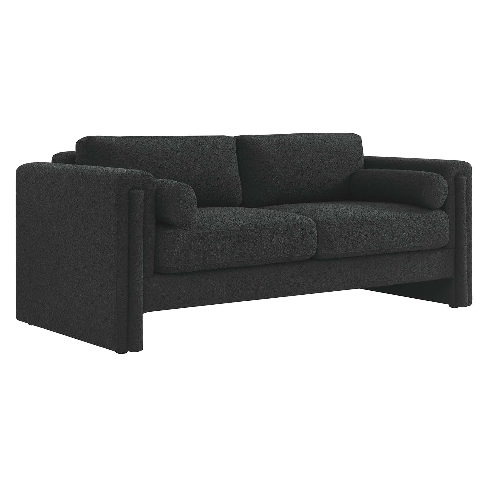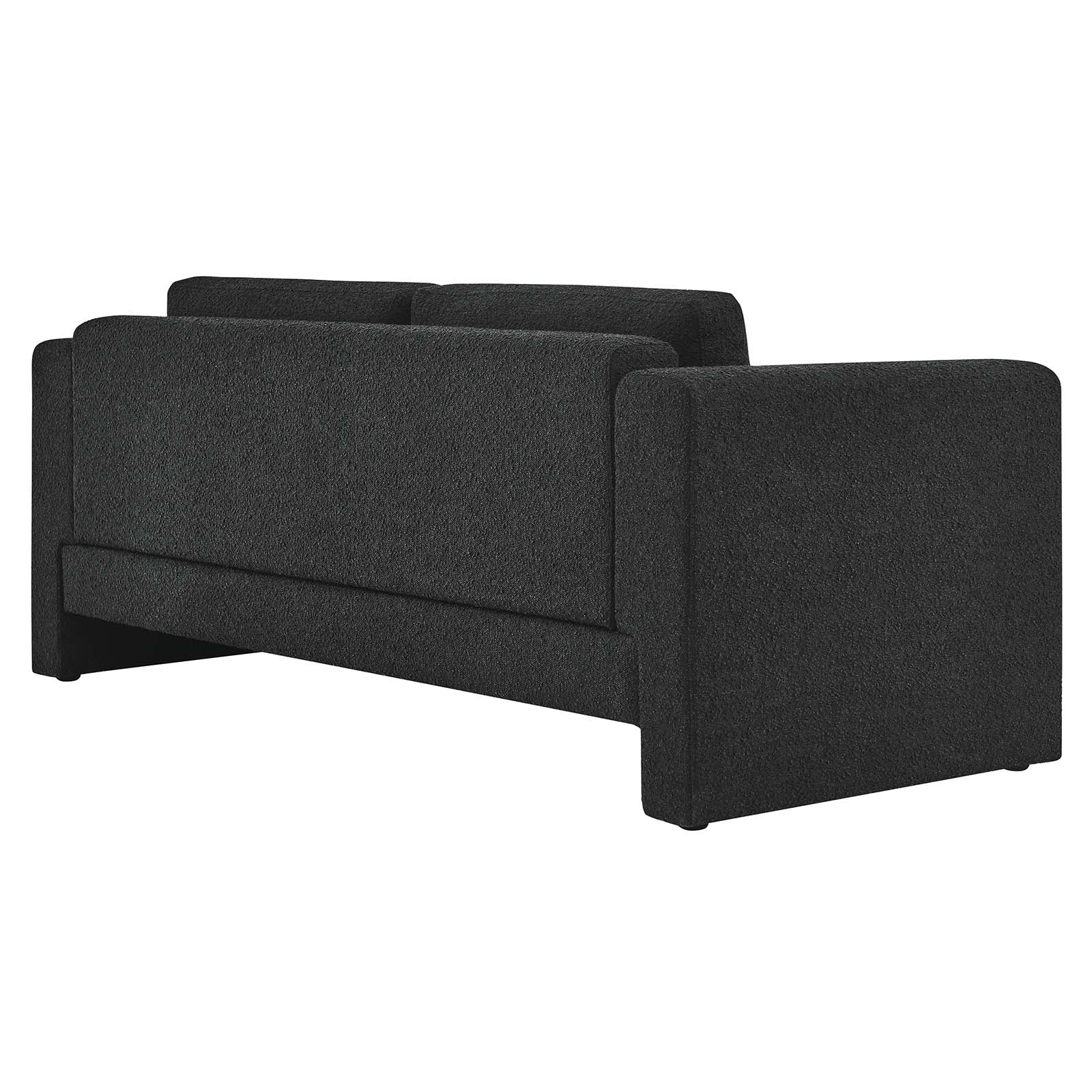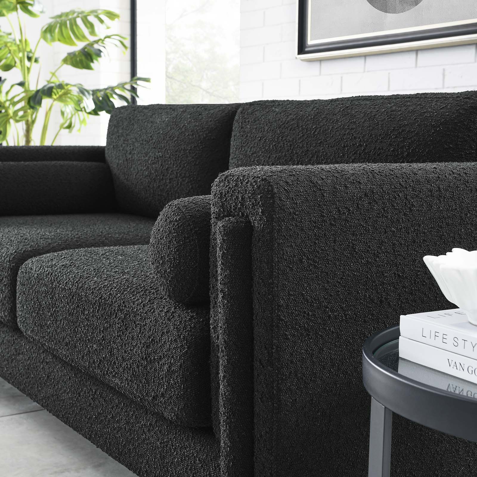 Indulge in the epitome of modern luxury and sophistication with the Nova Deep Loveseat. Crafted with a sturdy wood and plywood frame, this sofa exudes modern elegance with its sleek lines, tailored silhouette, and complementing bolster pillows. The adjustable non-marking foot pads protect your flooring while providing sturdy stability. Sink into cozy comfort with the dense foam padding, individualized pocket spring support, and soft, durable boucle fabric upholstery with a charming nubby texture on this three-seater sofa. The cushions and cushion covers are zippered and removable. Enjoy unmatched support with the pocket coil springs that offer a premium seating experience. Assembly is required with easy to follow assembly instructions. Weight Capacity: 990 lbs.