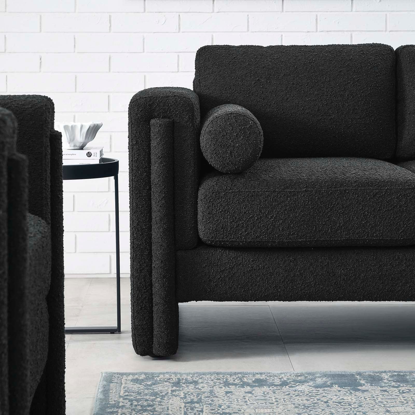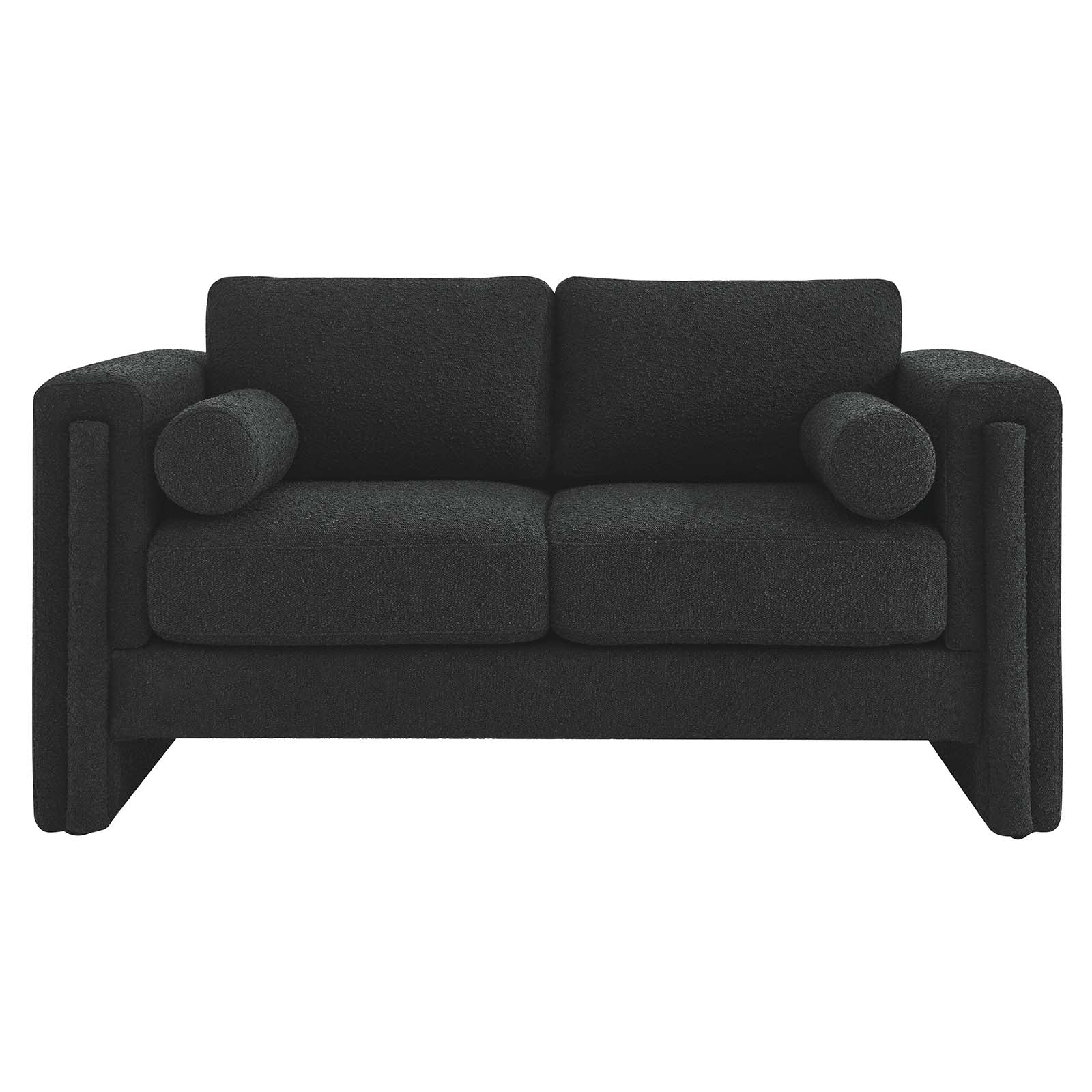 Indulge in the epitome of modern luxury and sophistication with the Nova Loveseat. Crafted with a sturdy wood and plywood frame, this loveseat exudes modern elegance with its sleek lines, tailored silhouette, and bolster pillows. The adjustable non-marking foot pads protect your flooring while providing sturdy stability. Sink into cozy comfort with the dense foam padding, individualized pocket spring support, and durable boucle fabric upholstery with a charming nubby texture on this two-seater sofa. The cushions and cushion covers are zippered and removable. Enjoy unmatched support with the pocket coil springs that offer a premium seating experience. Assembly is required with easy to follow assembly instructions. Weight Capacity: 660 lbs.