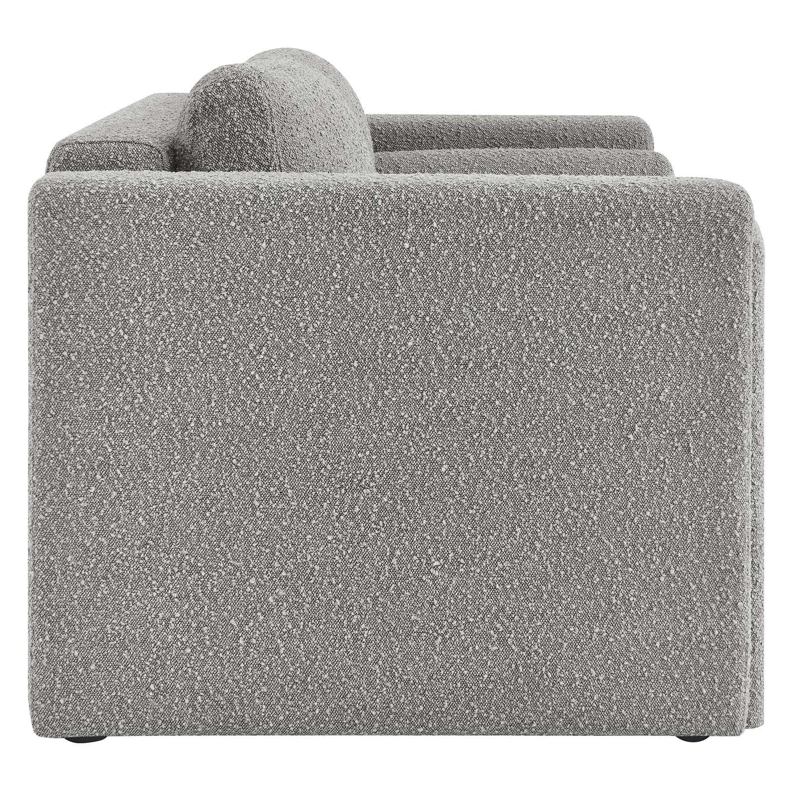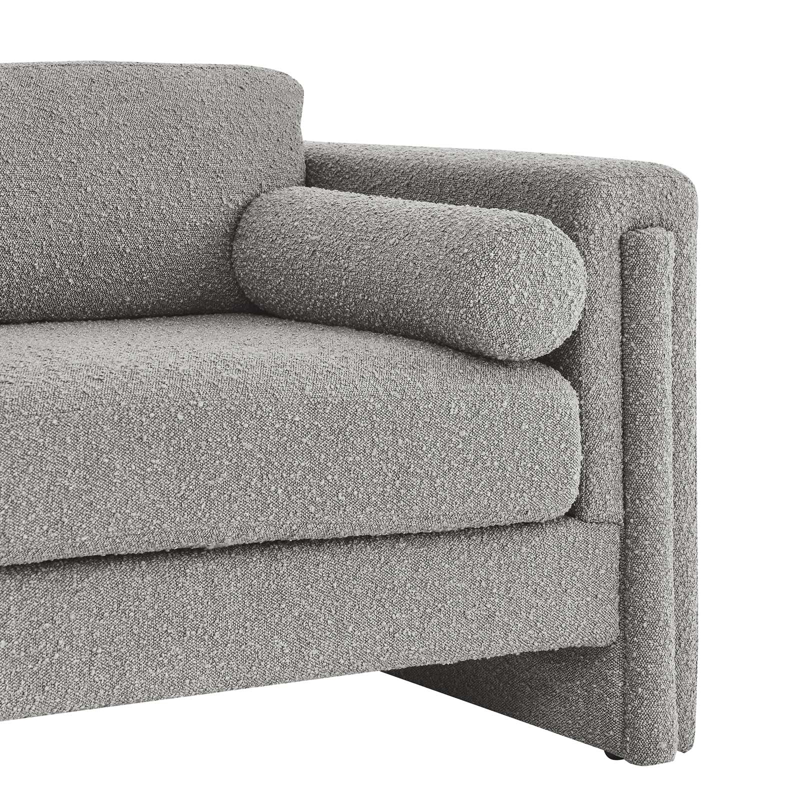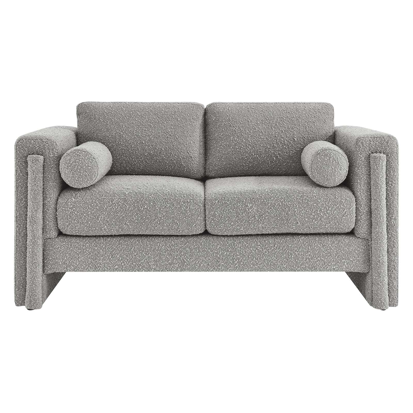 Indulge in the epitome of modern luxury and sophistication with the Nova Loveseat. Crafted with a sturdy wood and plywood frame, this loveseat exudes modern elegance with its sleek lines, tailored silhouette, and bolster pillows. The adjustable non-marking foot pads protect your flooring while providing sturdy stability. Sink into cozy comfort with the dense foam padding, individualized pocket spring support, and durable boucle fabric upholstery with a charming nubby texture on this two-seater sofa. The cushions and cushion covers are zippered and removable. Enjoy unmatched support with the pocket coil springs that offer a premium seating experience. Assembly is required with easy to follow assembly instructions. Weight Capacity: 660 lbs.
