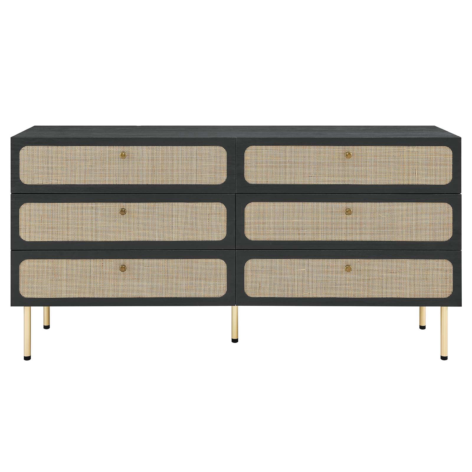 Refresh a bedroom with the textured detail of the Terra 6-Drawer Dresser in Black. Featuring beautiful oval rattan on the drawer fronts, this 6-drawer dresser updates a Fjordary bedroom or guest room. Six spacious full-extension drawers offer ample storage space for clothes, linens, and more. Resting on adjustable feet with non-marking pads, this full-size dresser is durably crafted with particleboard and a wood grain laminate to bring natural organic aesthetics to your bedroom decor. Assembly required.