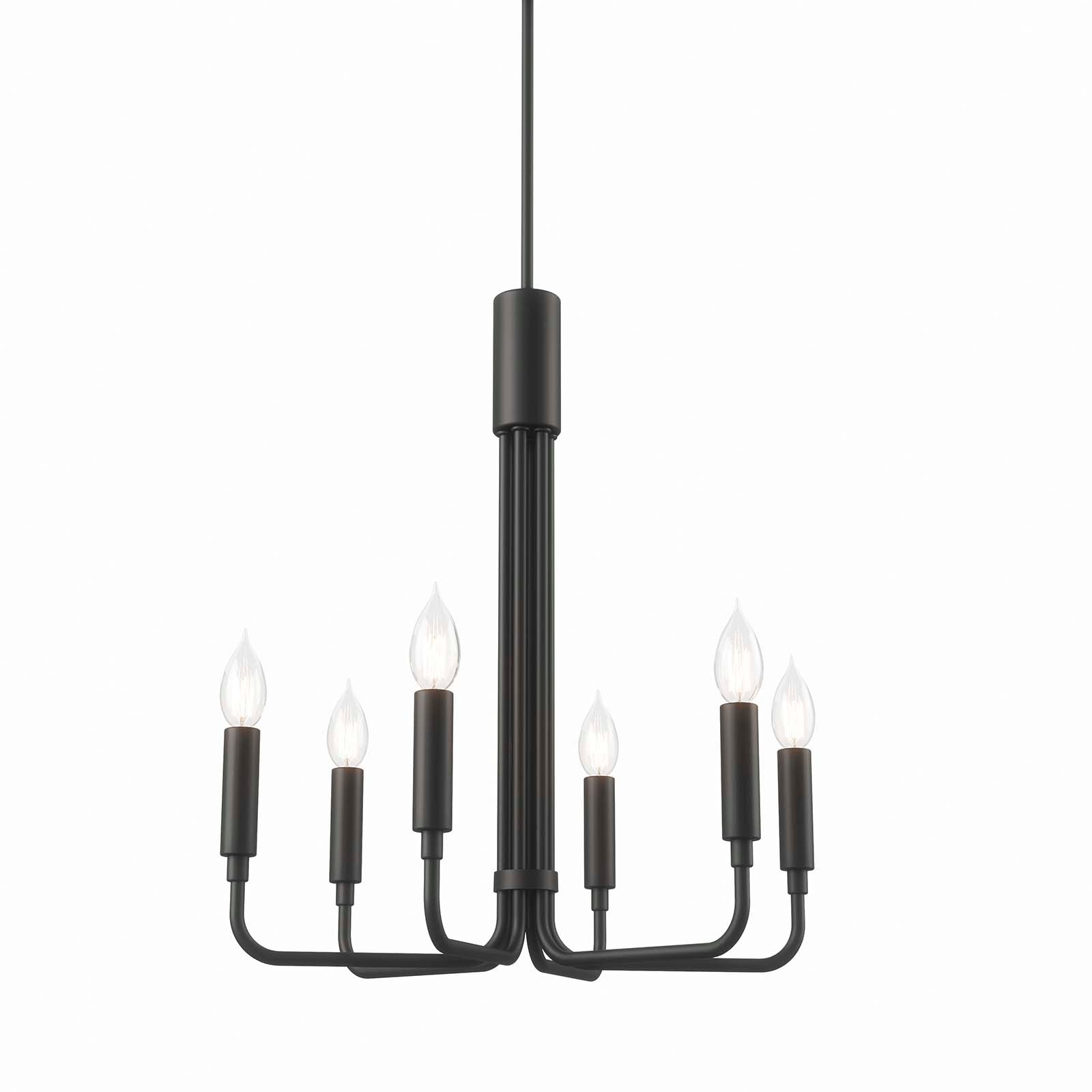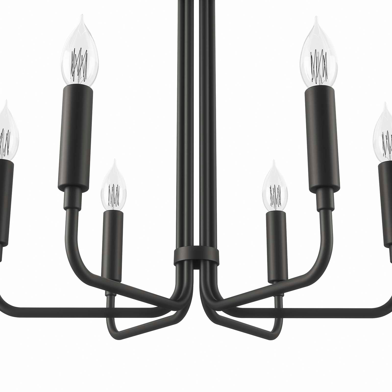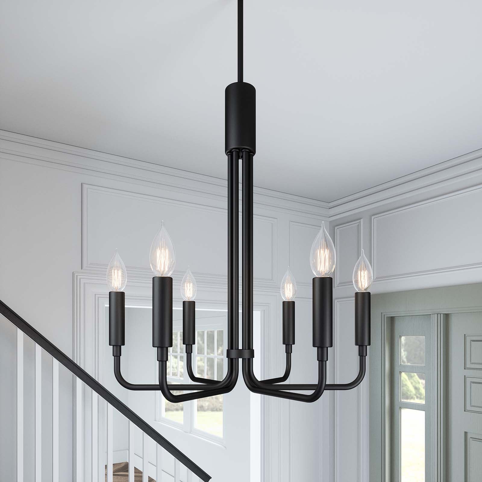 Illuminate your living space with the artful elegance of the Zenith 6-Light Chandelier in Black that complements a variety of decors from mid-century modern to minimalist contemporary. A timeless piece for your living room, dining room, entryway, or office space, this chandelier light features six sleek arms that extend out from a cylindrical centerpiece with ceramic lamp holders to host exposed light bulbs. Compatible with sloped ceilings, Zenith has a ceiling canopy with a swivel adaptor and features a five piece, height-adjustable hanging rod to suit a range of ceiling heights. The Zenith Light Fixture is ETL listed for damp locations and requires six E12 light bulbs 60W max or LED equivalent (not included). Luminaires that are “Suitable for Damp Locations” are approved for areas that are regularly exposed to moisture and condensation. Professional installation required.